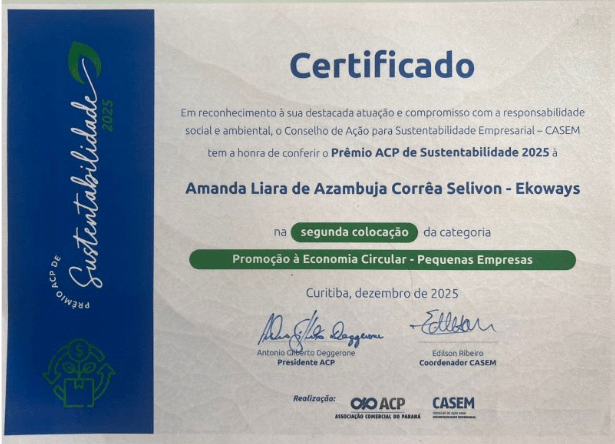 O Prêmio ACP de Sustentabilidade 2025 traz à luz empresas que ousam desafiar o status quo, redesenhar modelos de produção e inspirar economias que respeitam o planeta — e as pessoas. Uma iniciativa do Conselho da Ação para Sustentabilidade Empresarial – CASEM da Associação Comercial do Paraná para valorizar ações de responsabilidade social e sustentável em empresas paranaenses. E, neste movimento, sentimos profunda sintonia com o caminho que a EkoWays vem cultivando desde 2017: um caminho que escolhe cuidar, educar, cooperar e regenerar.